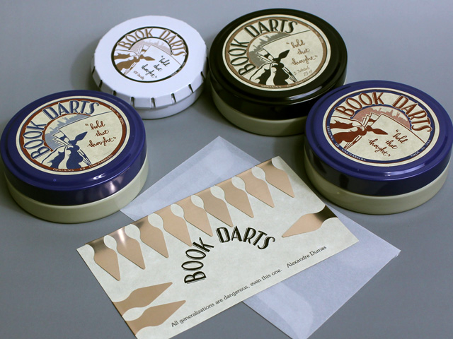 ページにクリップするタイプの金属製のブックマーク「BookDarts」のパッケージ(ブリキ缶)リニューアルに伴い、商品名を一部変更しました。同時に新たな仲間が増え、缶入り4種類とエンベロープの5種類になりました。